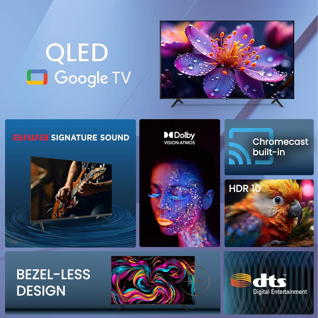 The AIWA A65QUHDX3-GTV 65-Inch QLED Google TV delivers premium picture quality, immersive Dolby Atmos sound, and smart Google TV features in a stunning bezel-less design. As an open-box offering, it presents a rare opportunity to own a large-screen QLED TV at exceptional value.