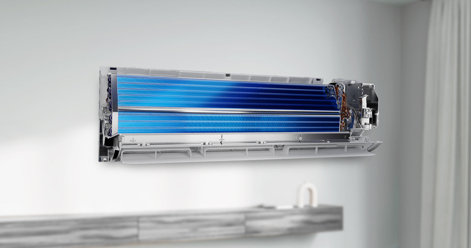 The blue fins protect the condenser and the evaporator coils from corrosion and leakage due to harsh climate, rainwater, salty air and humidity. It also enhances the efficiency and long life of the AC.