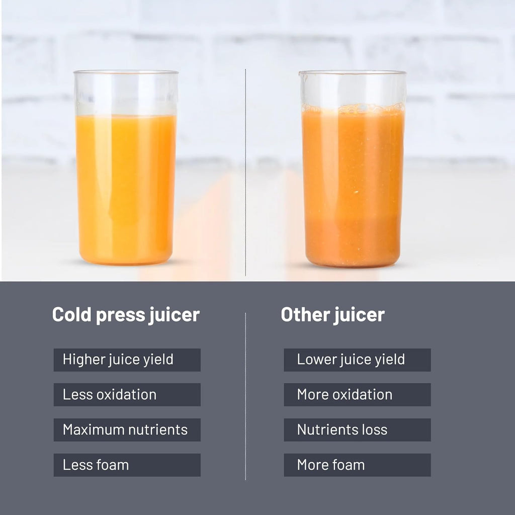❄️ Cold Press Technology: Operates at a slow speed of 87 RPM to retain nutrients, flavor, and freshness in every drop.