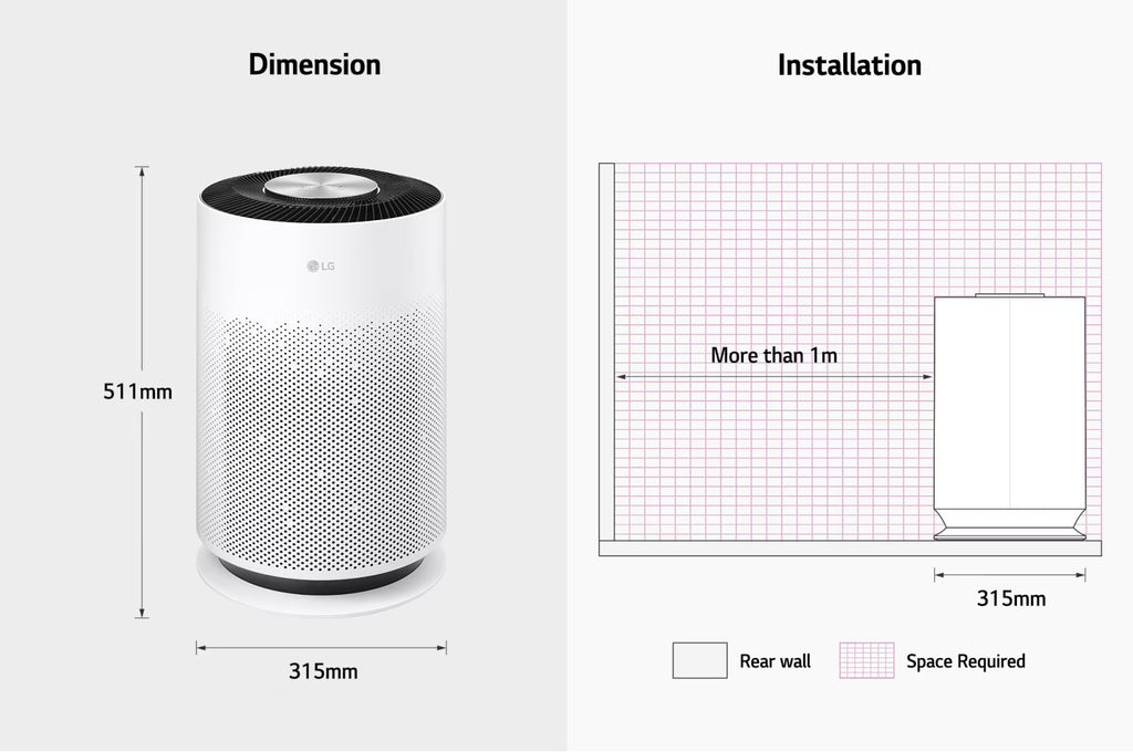 At just 315 × 511 × 315 mm, the LG PuriCare™ 360° Hit fits perfectly in any corner without compromising coverage. The modern white finish complements every interior — whether bedroom, living room, or office.