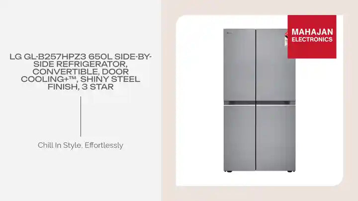 Bring home next-generation freshness with the LG GL-B257HPZ3 650 L Side-by-Side Refrigerator, featuring Smart Inverter Compressor, Door Cooling+™, and Convertible Storage. Its elegant Shiny Steel finish adds a touch of luxury to your kitchen, while advanced technologies like Smart Diagnosis™ and Auto Smart Connect™ make it energy-efficient, intelligent, and built for Indian homes.