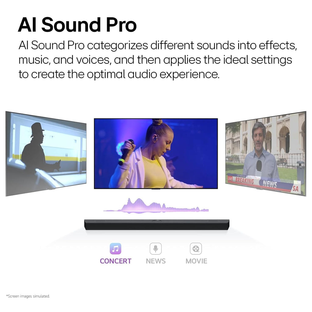 LG’s advanced AI Sound Pro automatically analyzes the content you’re watching — movies, sports, news, gaming, or music — and optimizes sound settings in real time for the best listening experience.