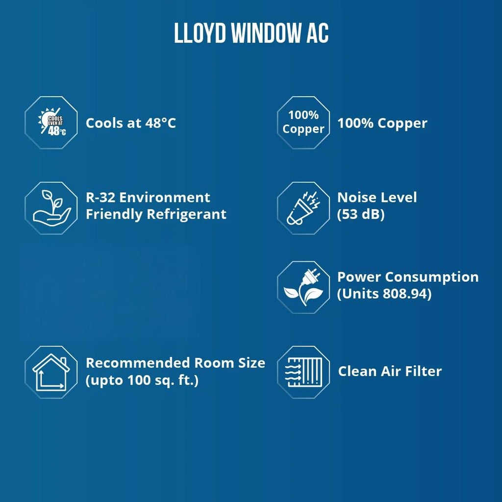 The Lloyd GLW12C2YWSEW 1.0 Ton 2 Star Fixed Speed Window AC is engineered for powerful and consistent cooling in Indian households and offices. Built with 100% copper coils, Blue Fin technology, and a robust fixed-speed compressor, it ensures fast heat exchange, corrosion resistance, and long-term cooling performance—even in 48°C peak summers.