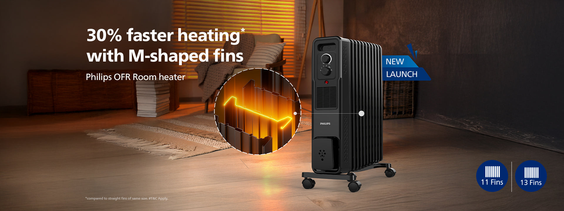 Experience luxurious, fast, and uniform heating this winter with the Philips CX3011 11-Fin OFR, engineered for superior comfort, safe operation, and energy-efficient performance. Designed with M-shaped fins for 30% higher heat dissipation, this premium heater delivers rapid, consistent warmth while ensuring comfortable breathing and all-round room heating—ideal for bedrooms, living areas, kids’ rooms, and office spaces.