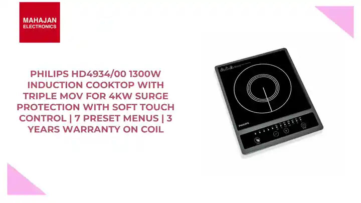 Philips HD4934/00 1300W Induction Cooktop | Triple MOV 4kW Surge Protection | 7 Preset Menus | Soft Touch Controls | 3-Year Coil Warranty | Mahajan Electronics Delhi NCR