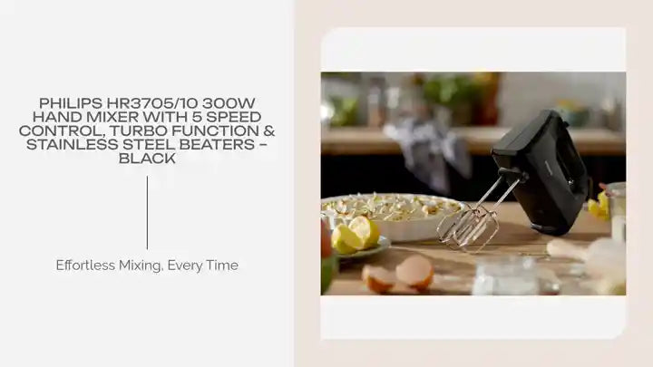 Experience effortless mixing and blending with the Philips HR3705/10 Hand Mixer, designed for convenience, comfort, and consistent performance. Whether you’re whipping cream, mixing cake batter, or kneading dough, this 300W hand mixer ensures superior results every time.