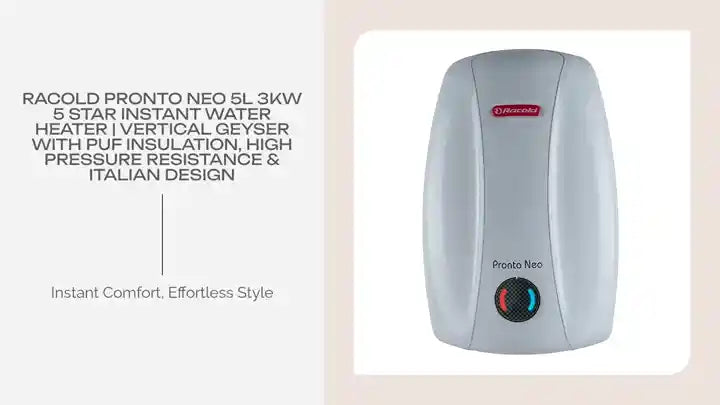 Fast, safe, and stylish—the Racold Pronto Neo 5L 3kW Instant Geyser is an ideal choice for homes seeking efficient water heating without compromising space or energy consumption. With Italian styling and engineered protection, it’s made for today’s young urban professionals who value speed, safety, and savings.