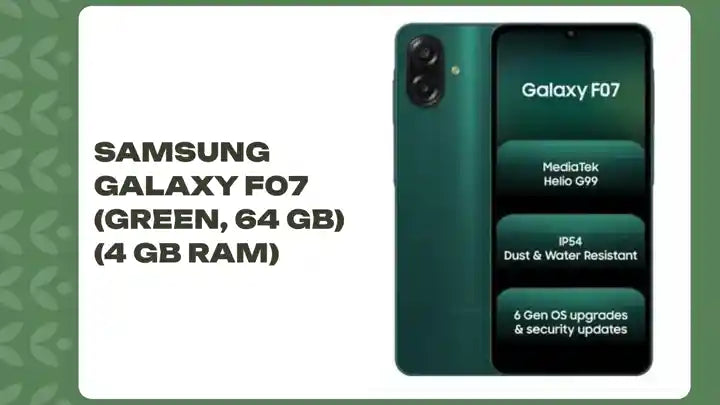 The Samsung Galaxy F07 in fresh Green colour is a budget‑friendly smartphone that doesn’t compromise on essentials. It packs a 50 MP dual rear camera setup (wide + depth) and an 8 MP front camera, letting you capture sharp daytime photos and decent selfies. The handset features a 6.7‑inch HD+ PLS LCD display with a water‑drop notch, giving you a large view for media, social media and casual gaming. Under the hood you get 4 GB RAM and 64 GB of internal storage (expandable via microSD), enough for everyday apps and media. With a long‑lasting 5000 mAh battery and support for 25W fast charging, you can stay unplugged longer and juice up faster. Designed slim at ~7.6 mm thickness and weighing ~184 g, it’s comfortable to hold. Software is handled by Samsung’s One UI over Android, with added perks like a side‑fingerprint sensor, dust/splash resistance (IP54) and modern connectivity options. All in all, the Galaxy F07 delivers good value – balancing display, battery, camera and build in a stylish, budget‑aware package.