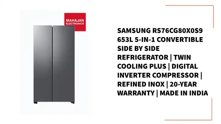 Experience premium cooling performance, intelligent storage flexibility, and refined aesthetics with the Samsung RS76CG80X0S9 653L 5-in-1 Convertible Side by Side Refrigerator. Designed for modern Indian homes, it blends advanced Twin Cooling Plus™ technology, energy-smart operation, and a durable Digital Inverter Compressor with a 20-year warranty. Perfect for families who value freshness, style, and sustainability.