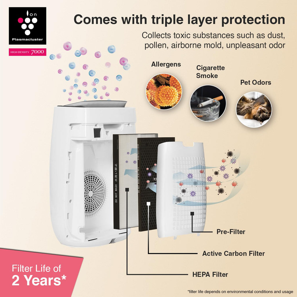 Experience hospital-grade air purification at home with the SHARP FP-J52M-W Wi-Fi Enabled Air Purifier, engineered in Japan and made in Thailand. Designed for modern Indian homes, this smart purifier combines Plasmacluster Ion technology, triple filtration, and real-time air quality intelligence to eliminate 99.97% airborne pollutants, viruses, bacteria, PM2.5 dust, allergens, smoke, and odors.