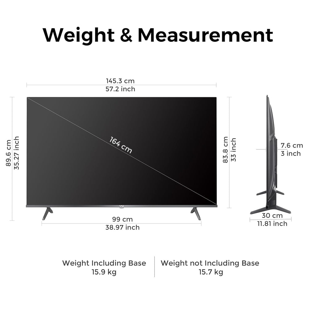 4K QLED | A+ Grade Glo Panel | 400 Nits Brightness | Dolby Vision | HDR10 & HLG | Motion Enhacement with MEMC | Cricket Mode | Cinema Mode | AI Smart Scene & Upscale | 24 Watt Sound | Dolby Audio | Auto Volume Control | HDMI 2.1 | 1.5GHz VuOn™ Processor | 2 GB RAM & 16GB Storage | VRR | ALLM | HDR Gaming | Game Mode | Game Dashboard I ActiVoice Remote Control | Apple Airplay | 2-way 5.3 Bluetooth | 5GHz Dual Band Wi-FI | Camera connectivity, Apple Airplay, Chromecast, Eye Comfort Mode, Game Mode |