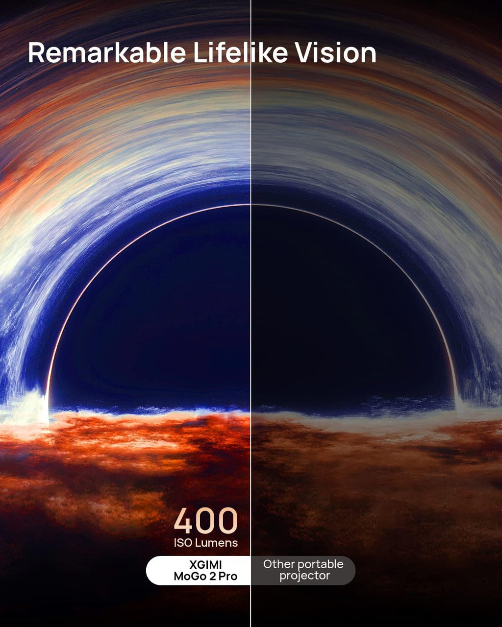 Enjoy lifelike detail with 1920 × 1080 pixels and 4K input support. The MoGo 2 Pro delivers cinematic clarity, accurate colors, and smooth motion at any screen size up to 200”.